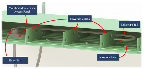 In Figure 13, it can be seen that the endoscopic system can potentially fit through the holes within the ribs of a Boeing 737-700. This proves that based on the geometric design, the system could traverse multiple tank chambers for the given aircraft type. The core components of the system are the endoscopic probe, consisting of a head and a tail, the entry mechanism, the control unit and a human machine interface. The following subsections will provide a detailed look into the subcomponents of the Eeloscope.