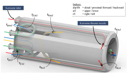 Based on the requirements from Section 2, an endoscopic robot was designed and prototypically constructed. Figure 13 shows the 3D-printed head, which contains an imaging sensor and the propulsion system. For the locomotion, the system has an active head that moves towards a desired direction. The tail of the system will only be actuated at the access mechanism using a feeding mechanism. The rest of the endoscopic body is passive. To ensure explosion protection, a novel actuation architecture is introduced for avoiding any electric actuators in the fuel tank. Therefore, the endoscope uses the kerosene itself as an energy transfer medium. The control unit can pump kerosene through the tail to the head of the endoscopic probe. Within the head, the kerosene will be guided to individual thruster nozzles on the outer hull. These thruster nozzles are responsible for a propulsion force that moves the whole system. This design uses the effects of Newton’s third law, which states that the action force equals the reaction force. Forces that are created from the nozzles will therefore move the endoscopic body. The nozzles are specifically arranged, so that it is possible to actuate six DoF at the tip of the endoscopic probe. To allow individual actuation of the degrees of freedom, the tail accommodates multiple small hoses, through which the kerosene can be pumped. Using this technique not only yields greater explosion protection compared to electric motors, it also heavily reduces the build volume of the endoscopic probe as it does not require any space for motors or batteries. This remote actuation is particularly beneficial, when the system moves within a confined space. A similar actuation method was used by Rico et al. in [38], Capara et al. in [39] and Ishii et al. in [40] since those systems are also using thruster nozzles to provide a locomotion force. Nevertheless, their architectures are using radial nozzle directions, which limits the rotational actuation. To overcome this limitation, a novel thruster nozzle and channel arrangement was created that guides the liquid towards the outlet in a tangential way.
