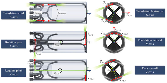 In Figure 14, one can see the routing of the channels of the Eeloscope in detail. The system is symmetrical with respect to the -plane and the -plane. This allows for the capability to actuate six DoF. The two red channels from nozzles and and the two green channels from nozzles and have individual feeding hoses, since their nozzles are used by multiple basic motions. The blue channel for nozzles and and the yellow channel for nozzles and whereas are splitting into four individual channels. This is possible since these channels are always used in a combined motion. As the routing of the liquid flows is entirely passive and rigid, it offers great potential for miniaturization. Currently, the channel diameters are sized to 3 mm. Due to the space saving routing, a hollow chamber in the center of the cylinder is available for placing sensors and end effectors. The design also features hollow passages along the whole z-axis, which allows the routing of further mediums e.g., compressed air for pneumatic actuators and data cables.