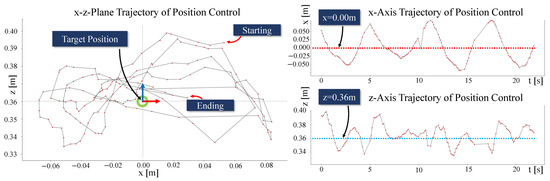 The resulting deviations of the position control can be seen in the graphs of Figure 21. In the left graph, the position in the x and z direction is plotted. The measurement was recorded over a duration of 25 s using the intrinsic camera with the ARUCO pose estimation package. In this time period, the system was trying to reach the target position. Since only a basic proportional controller was used, the system tends to overshoot.