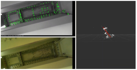 As described in the previous subsection, it is preferable to provide a camera vision-based pose estimation to maintain a stable position within the tank. In addition to that, it is also desirable to estimate the global location of the system within the whole fuel tank. For this problem, SLAM algorithms are of special interest. As SLAM algorithms are available in open-source packages, the orb-slam package from Mur-Artal [43] was applied to the input image of an empty and externally illuminated fuel tank section of the Boeing 737-700 wing demonstrator. The main goal here was to ensure that a generic monocular visual SLAM algorithm can extract enough image feature for computing a pose estimation. The result can be seen in Figure 22. The lower left image is the input image. On the upper left image, one can see the gray-scaled input image with the green feature landmarks that are tracked within the image sequences. The computed pose estimation is represented by the red arrow in the right map. In the future, the geometric accuracy and the capabilities for localization over multiple tank chambers must be evaluated. Here, it is especially interesting to evaluate the capabilities regarding the optical similarity of all tank chambers.