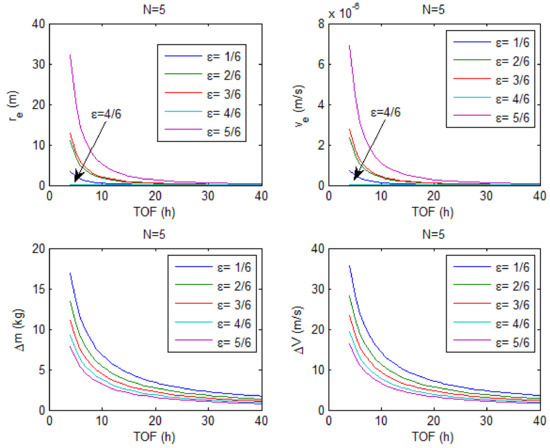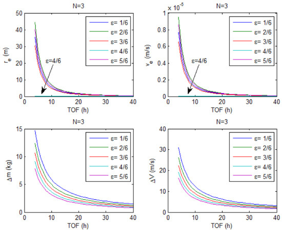 It can be seen from Figure 1, Figure 2 and Figure 3 that the increase of the TOF can improve the terminal position and velocity accuracies and lower the fuel consumption. Nevertheless, there are limits for such improvement, which are related to factor . Generally speaking, when TOF is short, different values of , except for , have distinctive impact on the four control performance indices, as we can see that the curves on the left-hand side are more scattered in response to different values of . As TOF grows larger, curves are gathering, which means the impact of diminishes while that of TOF becomes dominant, i.e., the larger the TOF, the better the control performances. However, in real practice, a very long duration of time for the rendezvous is sometimes not welcome, especially in emergency cases, so one should make balance with other design parameters. From Figure 1, Figure 2 and Figure 3, it is very interesting to see that when , the control performance indices, and , are much smaller than other values of for each N, and change little as the TOF varies (a line parallel with the TOF axis). Note that is very close to the golden ratio (0.618), which we can see also plays an impressive role in our problem. Another fact can be seen is that the terminal velocity deviations are all on the order of for different values of N due to the last delta-v exerted. Therefore, to identify a good combination of the design parameters, one can now first set .