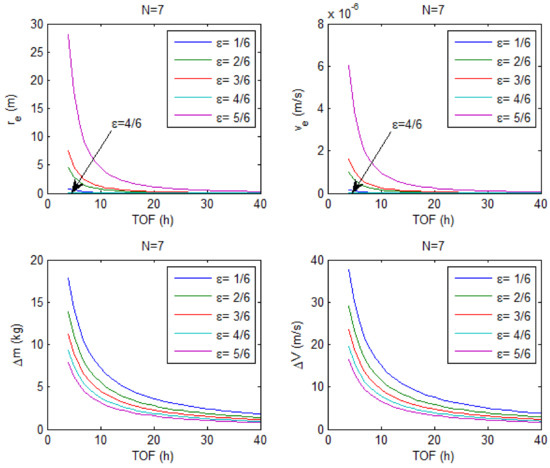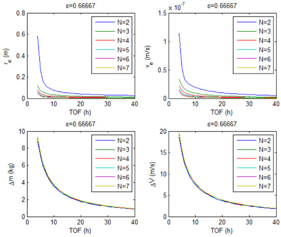 Next, we move on to select the values of N and TOF based on . The data is reorganized to show in Figure 4, where one can first notice that the cost indices ( and ) seem independent with N because all curves overlap with each other, and as TOF grows, and become smaller. Therefore, we take TOF = 40 h. Then we seek to select the value of N from the upper two subplots. Since is smaller than 1.5 × 10−7 m/s for all values of N, we mainly focus on the subplot. It should be noted that we do not hope the number of segments is too large because too many thrust firings bring about larger probability of failure. Seen from Figure 4, the curves gather except for N = 2 which has obvious larger position deviations for all TOF values. Starting from N = 4, the differences among curves are negligible. Therefore, we choose N = 4.