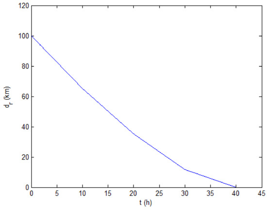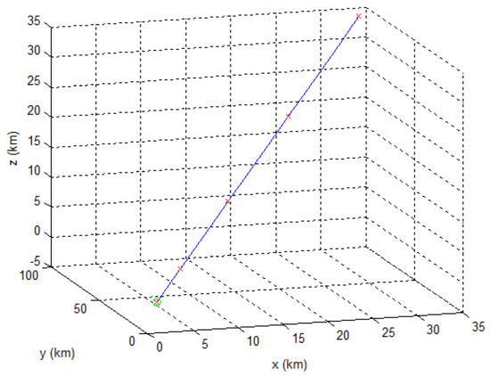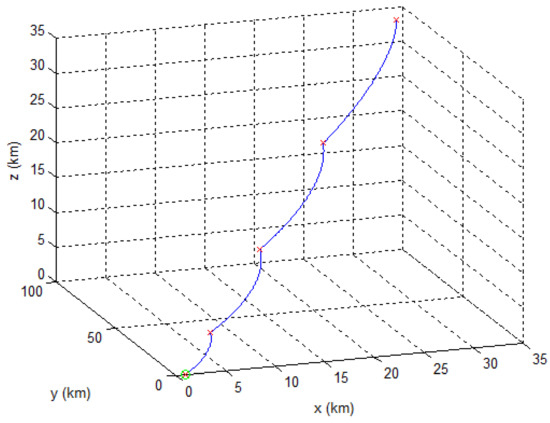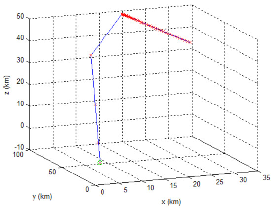 To sum up, taking the design parameters as , , and , the resultant terminal position deviation () is less than 0.01 m, terminal velocity deviation () is less than m/s, the fuel consumption () is less than 1 kg, and the total delta-v () is less than 2 m/s. The approaching trajectory in the orbital frame and the associated relative distance are given in Figure 5 and Figure 6, respectively, where in Figure 5 the red crosses denote the locations where the constant thrust is on, and the green circle displays the required location. Table 4 gives the exact value of each delta-v along the routine, , as well as the thrusting time, , and fuel consumption, .