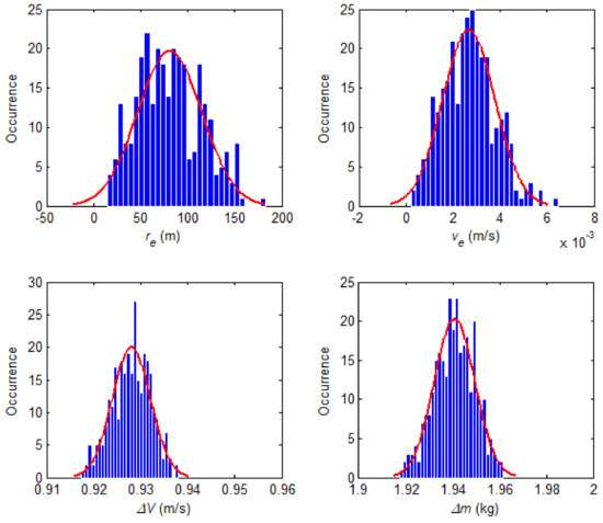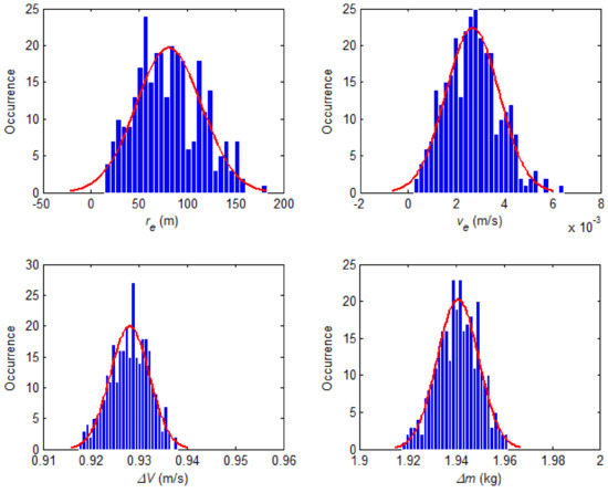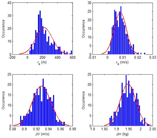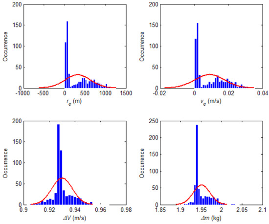 For error set I, one can see from Table 6 and Figure 9 that, the terminal position deviation can reach 183 m if all errors are taken, while the maximum of the terminal velocity deviation is 0.006 m/s, and 1.961 m/s and 0.938 kg for and , respectively. Small standard deviations (0.009 m/s and 0.004 kg) implies that the navigational error and implementation error have little impact on and , but on terminal position instead. Another fact is that the last corrective control is very effective to diminish the terminal velocity deviation.