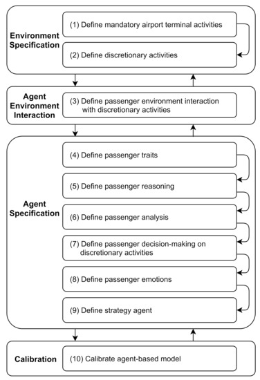 Figure 1 shows the steps that were taken to fulfil the research objective. The existing Agent-based Airport Terminal Operation Model (AATOM) [39,40], that includes the main passenger handling processes, was extended to include complex passenger decision-making about discretionary activities. AATOM contains passenger agents, operator agents, and orchestration agents [40].