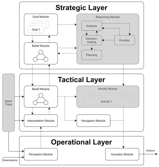Discretionary activities are pursued based on passengers’ freedom of choice, and decision-making. Decision-making is a complex cognitive process, and is influenced by passenger traits, time availability, affective states, perception, and anticipation. Existing research related to modeling of discretionary activities at airport terminals does not attempt to formalize a cognitive framework for passenger decision-making [3,4,5]. Instead, probabilistic models are used to directly specify passenger decision-making on discretionary activities. An advantage of such a high-level modeling framework is the simplicity of calibration of the formal model. However, such a framework does not represent realistic human reasoning and decision-making. Therefore, detailed cognitive modeling of passengers is required to represent discretionary activities.