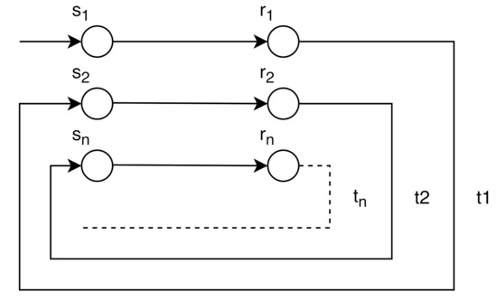 The architecture of reasoning is based on behavior and perception chains [30,31], described in Section 2.3, which allows for realistic modeling of human decision-making. The ability of agents to simulate future behavior is incorporated in the reasoning module. Simulation of behavior and perception chains, seen in Figure 3, drives decision-making and therefore planning. Here, is the sensory state of action n, the response preparation state of action n, and is the time duration from to . Prospective time estimations are used as links between perceptual activity and response preparation states. Thus, is a prospective time estimation an agent makes of action n. Simulated sensory states can elicit emotions which influence decision-making behavior [30]. This is addressed in Section 4.8.