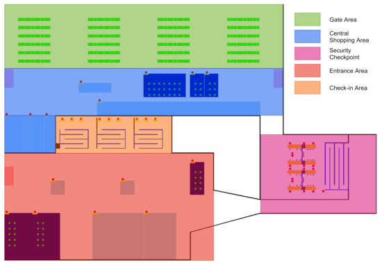 Check-in, security checkpoint, and gates, are modeled as areas related to mandatory airport terminal processes. In AATOM, areas are objects, and are shapes accessible to a all human agents [39,40]. Check-in areas contain queues, desks, and check-in operators which check passengers in. Security checkpoint areas consist of queues and checkpoint lanes. Checkpoint lanes have belts, a walk-through metal detector, and an X-ray sensor. Security checkpoint areas contain X-ray operator, physical check operator, and luggage check operator agents. X-ray operators operate based on the X-ray sensor output. Physical check operators perform physical checks if the walk-through metal detector alarms. Luggage check operators perform luggage checks on luggage that is detected by the X-ray operator. The specification of the operator agents is provided in [40]. Gate areas may contain seats which passengers can use waiting before flight departure.