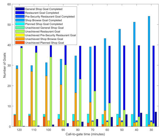 Total time, , is the sum of all prospective time estimates of a passenger agent. It represents the passenger’s time expectation to complete all existing goals. is impacted by affective states, described in Section 4.8. Total planned time, . Here is a contingency factor accounting for uncertainty in the total time estimation. A passenger at the airport terminal entrance has high time estimation uncertainty, whereas at the gate uncertainty is low.