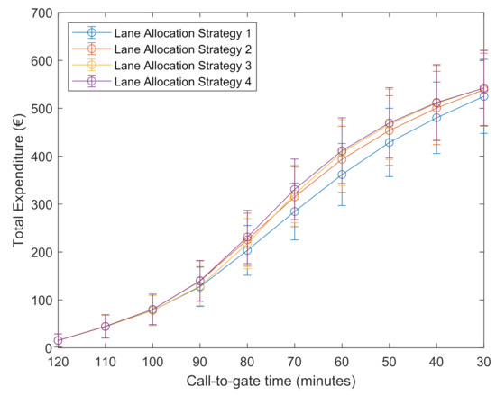 This section shows how the developed model was used for analysis and operational decision-making. The scenarios are described in Section 5.1. The experimental setup is presented in Section 5.2. The results of the call-to-gate and security lane allocation experiments are discussed in Section 5.3 and Section 5.4, respectively. Section 5.5 shows how call-to-gate strategies are influenced by security lane allocation strategies.