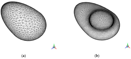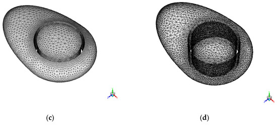 Figure 3 shows the cubic computational domain used for the current study. The boundary condition of the present study for each face was given such that the face through which flow enters the domain was given as a velocity inlet with a magnitude of V∞ = 5 m/s, and the pressure outlet was given by the values of standard atmospheric conditions as shown in Table 2. The meshes used for the airship model in the current work are shown in Figure 4. The rest of the faces and the model were given symmetry boundary conditions. Once the numerical setup was defined, the pressure-based solver was used to solve the RANS equations.