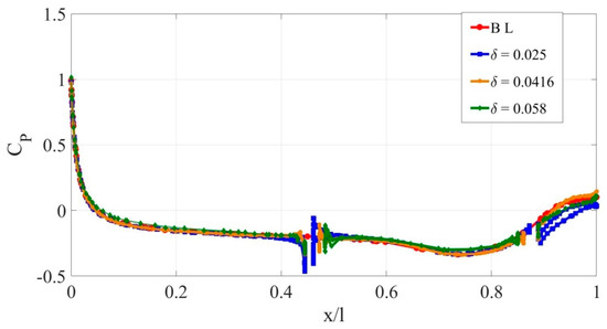 Pressure coefficient Cp at α= 0° for the baseline model and models with slot openings.