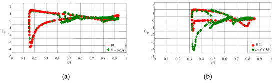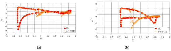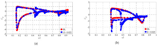 Figure 7a,b represents the pre-stall and post-stall regime pressure distribution over the airship at δ = 0.025 for α = 40° and α = 60° respectively. At α = 40°, the pressure distributions of the airship at δ = 0.025 and the baseline (BL) model show a slightly significant difference. However, at α = 60°, i.e., the post-stall region, the pressure coefficient under the curve that is along the length is slightly larger, leading to an increased form of drag. A similar trend is observed for α = 40° and α = 60°, respectively, at δ = 0.0416 in Figure 8. In the case of the circular slot ratio δ = 0.0583, the pressure difference is significant from the leading edge itself, as shown in Figure 9b for α = 60°. Usually, the high-pressure region on the bottom and the low-pressure region on the top of the airship are responsible for the aerodynamic characteristics. The circular slot modifies the pressure distribution and enhances the aerodynamic characteristics. That is, the high-pressure region sweeps through the slot and increases the momentum on the top surfaces, which is the reason for delaying the flow separation. In Figure 9a, it is visible that the effect of the slot appears even from the leading edge itself and modifies the pressure distribution throughout the body.