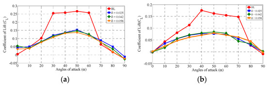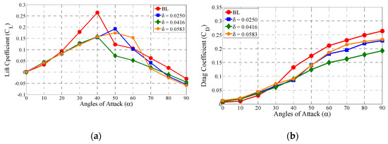 (a) The aerodynamic behavior of lift and (b) drag coefficient as functions of angles of attack for various circular slot ratios (δ).