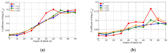 The aerodynamic behavior of drag coefficient for different circular slot ratios and various angles of attack at (a) θ = 30° and (b) θ = 60°.
