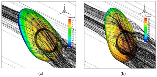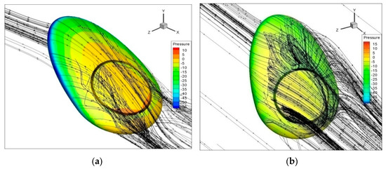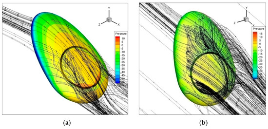 Figure 14, Figure 15 and Figure 16 depict the aerodynamic properties of hybrid airships with slots where the flow field is described based on the streamline flow pattern. Here, the flow topology of the pre-stall region and post-stall region is described at α = 40° and α = 60° for hybrid airship with slots. In the pre-stall region, when the airship reaches α = 40°, it shows attached flow over the suction side, and after some point, it shows flow separation. Indeed, the flow of air from the bottom to the upper surface energizes the upper boundary layer, allowing it to maintain attached to the surface. At the post-stall region, from the velocity field, it can be observed that the flow field tends to turn around in the hybrid airship models with slots, moving from the pressure side to the suction side. Hence, it forms a strong coherent trailing vortex downstream of the airship model. This phenomenon reaches higher values for maximum angle of attack; hence, the flow gets stalled at α = 50° for δ = 0.025, δ = 0.0416, and δ = 0.0583. In δ = 0.0583, a very strong coherent trailing vortex appears downstream of the airship model.