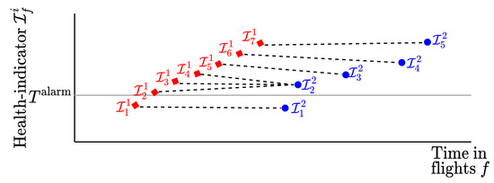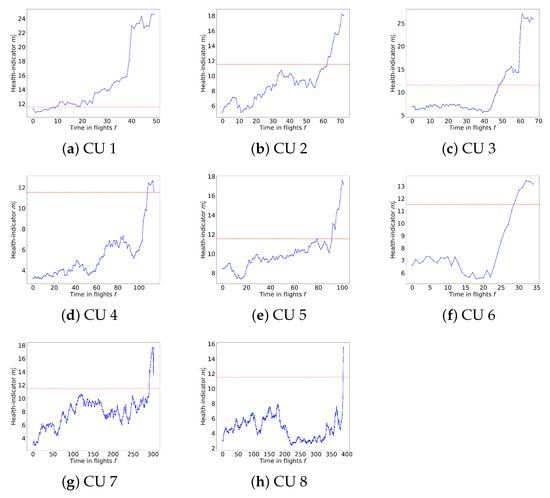 Figure 6 shows that the CUs 4, 6, and 8 failed soon after the health indicator reached the alarm threshold—when the health indicator reached a value of approximately 15. The degradation trend around failure showed a monotonic increase. In contrast, CUs 1,2,3,4,5, and 7 failed when the health indicator reached a value of 20. Furthermore, the degradation of these CUs often accelerated toward failure.