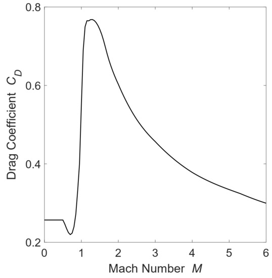 where an inverse-square gravity field is assumed and is the aerodynamic drag, which is regarded as independent from the value of the payload mass in the present approach. For each sub-rocket, the reference cross section is a function of the rocket diameter d and the number of hybrid engines N, i.e., . The aerodynamic drag coefficient of both stages is calculated as a function of the Mach number by means of the typical law for rockets reported in Figure 1.