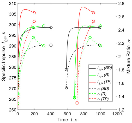 Specific impulse and mixture ratio histories for the best solution of each feed system. The BD solution was obtained with and R and TP solutions with .