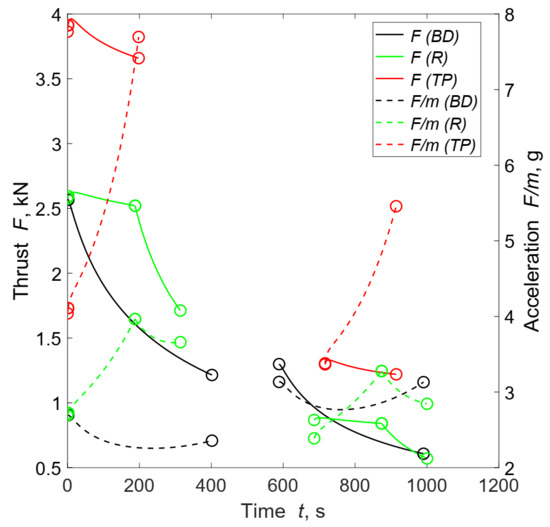 Thrust F and longitudinal acceleration histories for the best solution of each feed system. The BD solution was obtained with and R and TP solutions with .