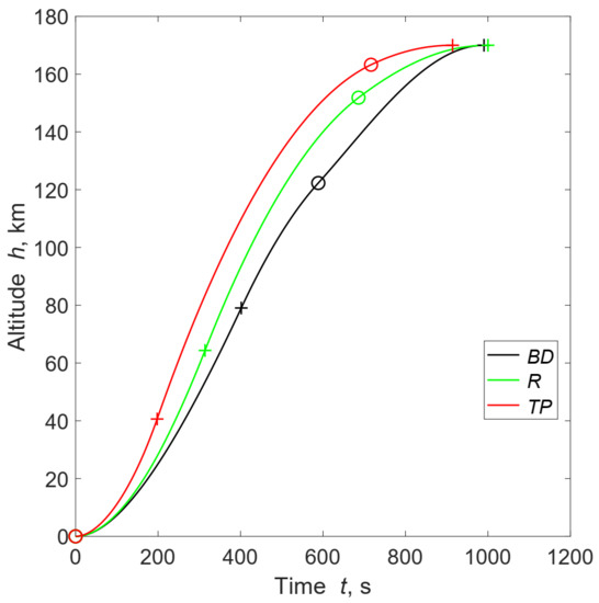 Trajectory for the best solution of each feed system. The BD solution was been obtained with and R and TP solutions with . The dots and crosses represent the stages ignition and burnout, respectively.