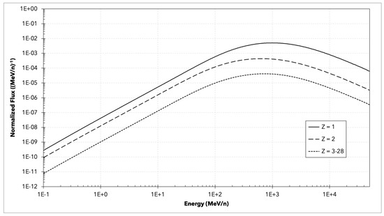 In general, the code requires an input file containing the desired parameters, source term, geometry, and tallies. The source term used in this work is obtained from the Badhwar–O’Neill 2020 model for a solar modulation of 400 MV to represent a period of a solar minimum [17]. The abundances of the source particles transported in this work (from Z = 1 to Z = 28) are presented in Figure 1, and their corresponding energy spectra are illustrated in Figure 2. The geometry used to represent the CRaTER instrument consists of stacks of cylinders lying on top of each other with the exact thickness of the sides, detectors, TEP volumes, and void regions of the CRaTER instrument. Table 1 provides the thickness and composition of each component used in the geometry simulated in this paper. To obtain the count rate as a function of LET, a tally was first used to calculate the energy deposited per source particle in D6, and was then divided by the detector thickness and multiplied by the source strength. We also utilized the unique feature in PHITS that allows the user to turn on and off the Landau–Vavilov energy straggling function to provide a comparison between the two resulting spectra. The results of the run with the Vavilov function are compared to the CRaTER instrument, while the results with this feature turned off are compared to the results obtained from HETC-HEDS, which is described in the following subsection. When comparing PHITS results to the measurements made by the CRaTER instrument, a geometric factor adjustment, , was applied to the simulated LET spectra to correct for ‘false’ triple coincidences. The functional form of the correction for the D5/D6 detector pair is given as