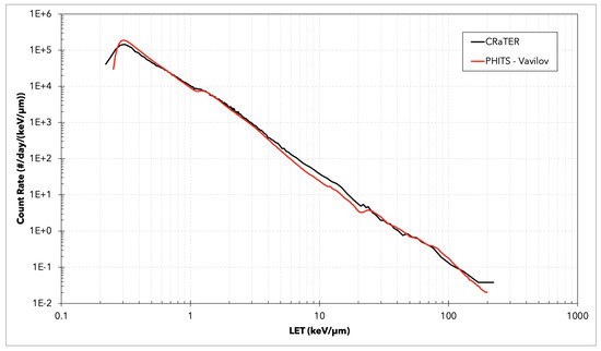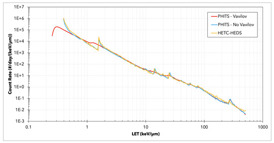 The LET spectra obtained from HETC-HEDS and PHITS without Vavilov energy straggling are presented in Figure 4. In comparison with the HETC-HEDS LET spectrum presented in [3], an improved smoothness is observed in the HETC-HEDS LET spectra created in this work, which is the result of sampling from a continuous GCR flux distribution rather than utilizing discrete lookup tables. Without Vavilov energy straggling, the LET spectrum from PHITS is very close to the one obtained from HETC-HEDS. Recall that the use of the Vavilov distribution shifts the HETC-HEDS LET MIPS from the average energy, which is what is provided by the Bethe–Bloch formula, to the most probable energy loss, which is smaller. The outstanding agreement in the LET spectra of HETC-HEDS and PHITS without Vavilov energy straggling, along with the agreements between CRaTER measurements and PHITS results utilizing Vavilov energy straggling, confirms the assertion provided in [3] that using a Vavilov distribution correction should fix the problem of the MIP peaks’ location and sharpness. This assertion also applies to the results of the deterministic code HZERTN presented in [3] as those results were shown to agree with the HETC-HEDS results.