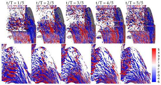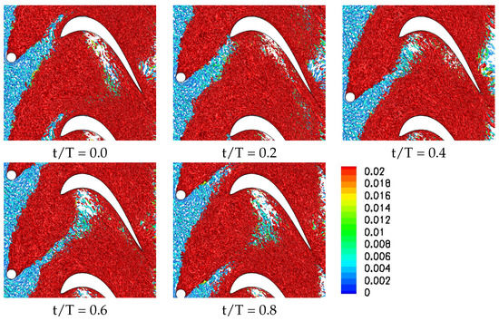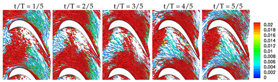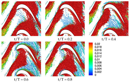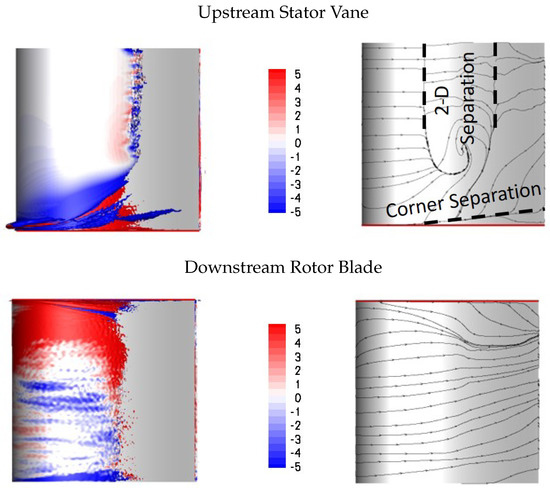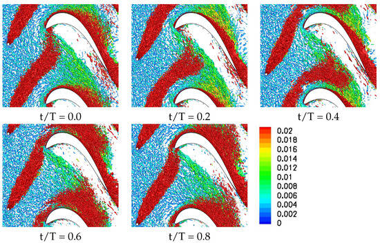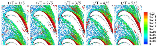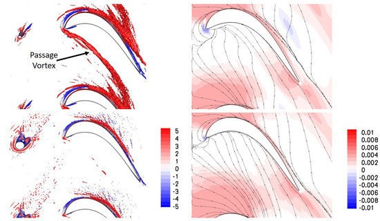 42] performed LES of a linear 50% reaction turbine stage with L2F blades. The passing wakes were shown to greatly diminish the coherence of the HV and PV and suppress laminar boundary layer separation from the suction surface. A new transient longitudinal flow structure was observed near the pressure side trailing edge.