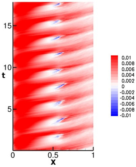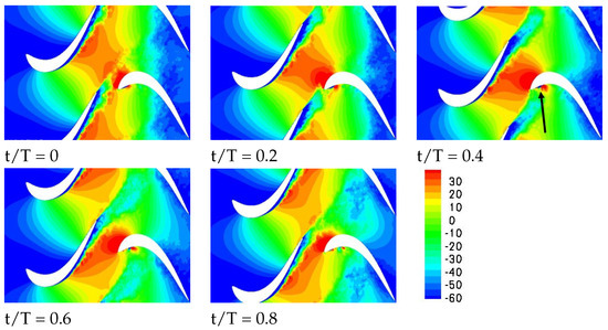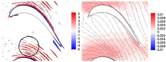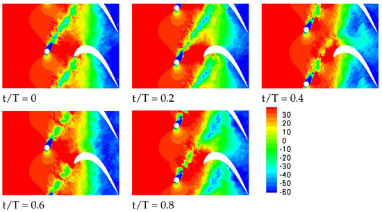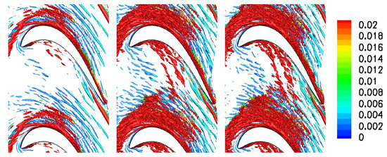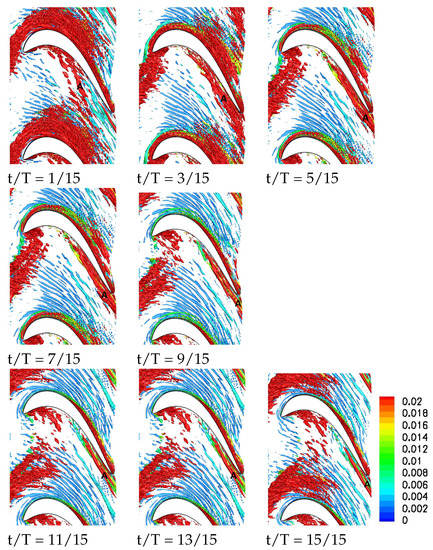To conclude, large-eddy simulations of a 50% reaction stage and a linear cascade with circular cylinder bar wake generators with two different diameters were carried out for a Reynolds number based on inlet velocity and axial chord length of 50,000. For the this Reynolds number, which is on the low end of what is seen on actual engines, considerable laminar separation from the suction surface and a passage vortex and corner separation lead to high total pressure losses. Because of the large size of the simulations, only a limited number of wake passing periods were simulated and the quality of the phase-averaged data was improved by using the proper orthogonal decomposition as a filter to remove the small-scale high-frequency content.