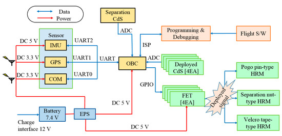 The subsystem of the DHRM CanSat is mainly composed of an onboard computer (OBC), communication system (COMS), sensors, and EPS. The onboard microcontroller unit (MCU: ATmega2560, Microchip Technology Inc., Chandler, AZ, USA) controls the operating systems and gathers the telemetry data from the payloads and sensors, which are subsequently sent to the ground station through the communication network. The CanSat used a communication system (ProBee ZE10, SENA Technologies Inc., San Jose, CA, USA) to communicate with the ground station because of its simplicity and low cost compared to other communication technologies. The telemetry data of the mission and the CanSat health were relayed to the COMS using a universal asynchronous receiver transmitter (UART) internal communication. The sensor module is composed of a global positioning system (GPS: AKBU6, AScen Korea Co., Geumcheon Gu, Seoul, Korea), an inertial measurement unit (IMU: EBIMU-9DOFV3, E2BOX Co., Gyeonggi-do, South Korea), and a cadmium sulfide (CdS) illumination sensor (GL5528, OEM Co., Wan Chai, Hong Kong). The GPS was used to determine the altitude and position data of the CanSat during the launch test. The CdS sensor was used to monitor the separation status and alignment of the CanSat during the flight. Furthermore, the EPS consists of two lithium-ion batteries (LG2N18650-22-R-V3PW, LG Co., Seoul, Korea) and a regulator that provides specific voltages of 3.3 V and 5 V, providing a sufficient power margin to operate the CanSat system at the maximum discharging power in the worst case.