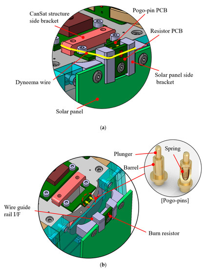 +ZX side plane edge of the CanSat through bolt fastening. The pogo pin connector consists of a cylindrical barrel, spring, and pin. It has several advantages, such as space-saving connections, relatively low sliding friction, a smaller contact area, and the ability to withstand frictional damage. The main purpose of using the pogo pins hardware in the mechanism is to provide an electromechanical connector for power connecting the edge of the CanSat plane and the resistor PCB during the mechanism activation. The surface mount resistor was mounted on the resistor PCB, which was mechanically constrained by bolts on the solar panel side brackets. The solar panel side bracket (made of aluminum Al-6061) was fastened on the