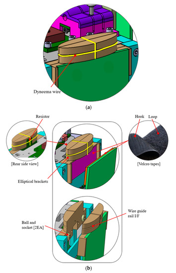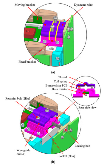 Figure 5a. A ball-shaped overhead tip of the screw bolts used to fasten the locking bolt on the solar panel acted as a ball, and a round notching was made on the surface of the fixed bracket for the socket. This mechanism has an in-plane constraint owing to the application of the ball and socket joints. The socket prevents the Dyneema wire from unintentional loosening in the vibration environment by restricting the movement of the ball in a specific nominal gap.