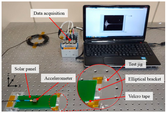 Figure 7 shows the free vibration test setup configuration of the solar panel employing the Velcro tape-type HRM. The Velcro tape fastener was mechanically attached to the HRM bracket base surface and the