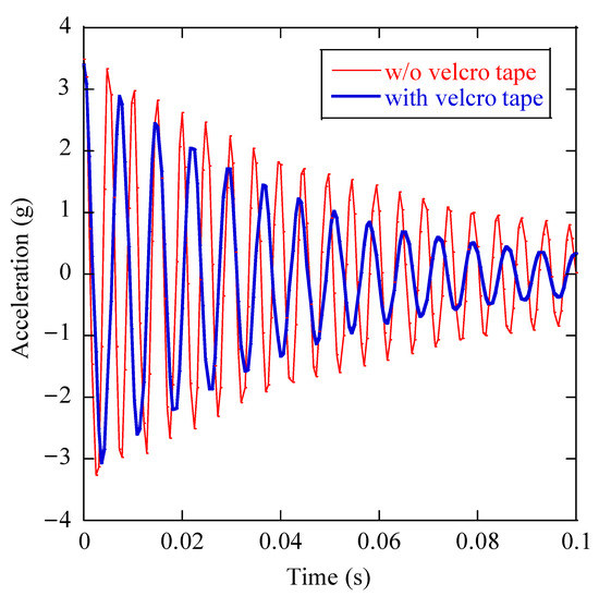Figure 8 shows the time histories of the free vibration responses of the solar panel. The results show that the vibration of the solar panel can be effectively suppressed by employing the Velcro tape on its mounting interface. The first eigenfrequencies of the solar panel module with and without the Velcro tape are 137.74 Hz and 206.18 Hz, respectively. The damping ratio calculated from the vibration period of the solar panel with the Velcro tape is 0.16, which is higher by a factor of 1.5 than that of the solar panel without using the Velcro tape. The ability of the Velcro tape to rapidly attenuate the transmitting vibration on the solar panel was verified by the free vibration tests. The application of the Velcro tape-type HRM in a deployable solar panel could ensure the structural safety of the installed solar cells by reducing the dynamic stress on the solar panels.