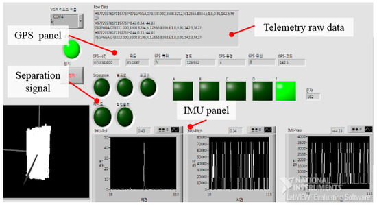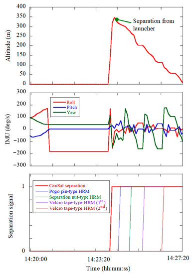 Figure 14 shows the flight status data obtained from the GPS, IMU, and OBC during the DHRM CanSat flight. The flight status data were successfully obtained, and the GPS launch status data show that the CanSat was at its peak altitude at the time of 14:23. Furthermore, the CanSat was separated from the rocket cargo bay at an altitude of approximately 350 m above the Earth’s surface. The altitude of the CanSat was controlled by a parachute during its descent to the ground. The deployment of all the solar panels was successfully conducted during the descent of the CanSat via telecommands from the ground station. The ground station received the solar panels’ separation signal, raw telemetry data, and real-time images from the onboard camera, which verified the holding and release function of the mechanisms proposed in this study.