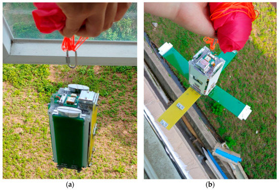 Figure 11a,b show the release function test setup of the proposed HRMs in the flight model of the CanSat before and after deployment of the solar panels, respectively. The tests were performed at ambient room temperature. The mechanisms were activated when the OBC received a deployment command signal from the ground station, and all the solar panels were successfully deployed as intended, as shown in