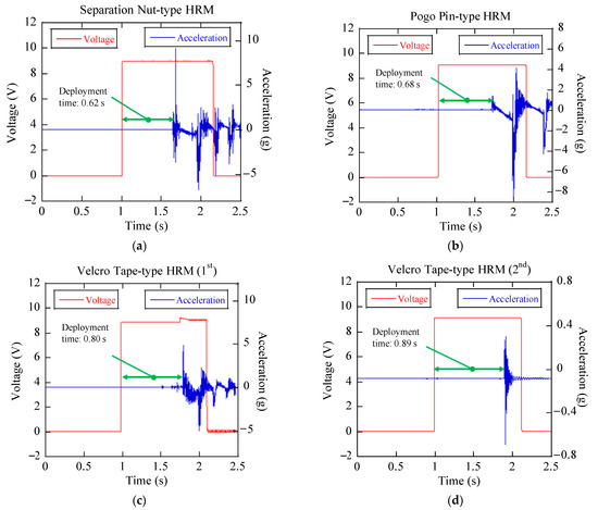 Figure 13. The results of the solar panel separation status and acceleration response during deployment indicate that all the panels were deployed within 0.89 s from the initiation of the burn wire triggering in the mechanism. The functional performance of the mechanisms at the system and subsystem levels was verified through these pre-launch on-ground tests.