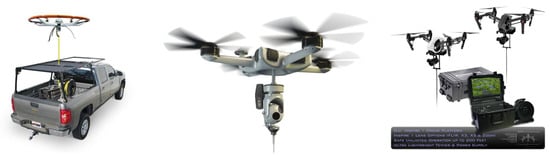 Regular eVTOL vehicles are not capable of executing a long-duration mission due to limited battery capacity, but there were cases where a tethered flight system was developed to overcome such limitation of flight time. UCON Systems developed T-Rotor for military operations, and Israel Aerospace Industries (IAI) came up with Hover Mast in a joint partnership with Sky Sapience. There are several products capable of tethered flight, such as Elistair’s safe-T and Power Line of Network Time Protocole, which replace the existing multicopters’ power system [13,14,15] which are shown in Figure 2. However, as these tethered flight systems are used to provide electricity to and communicate with multicopters of small size designed mostly for observation and communication relay, the presence of power cable does not greatly affect the dynamic characteristics of multicopters.