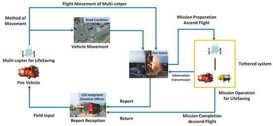 Multicopters can be used to perform lifesaving missions in areas inaccessible to fire-fighting ladders or where there are restrictions on the deployment of elevated ladders. However, the battery-equipped multicopter has a relatively short endurance due to limited battery capacity, so it cannot reliably perform rescue missions for a long time. The size of multicopter should be suitable for lifesaving operations without causing an accident and interfering with the performance of other workers’ missions after arriving at the site regardless of the method of transport to the fire or disaster site. In addition, it is required to guarantee good flight performance in various conditions such as ascending flight for approach, hovering while on board and descending flight for landing during rescue missions. Figure 3 shows the operational process of a tethered multicopter for rescue purposes. Once an emergency is reported, fire trucks and multicopters are immediately dispatched to the emergency site. After arriving at the fire site, a safety space of a certain size necessary for multicopter take-off and landing must be secured. Once the safety space is secured, the conditions and location of stranded people should be identified in detail. When the detailed information is obtained, the heavy-lift tethered multicopter should start its flight for rescue mission. It has to hold not only its position to hover around the contact point, but also its attitude angles even when there exists weight shift while rescued person is boarding. After the multicopter safely lands on the truck and unloading the rescued person, it continues the rescue operation repeatedly until there are no people left in the building. After the execution of such a mission, the power supply system and the entire multicopter as well as its equipment should be checked, and in case repairs are required, they should be carried out in line with the proper procedures with maintenance being conducted on a regular basis [25,26].
