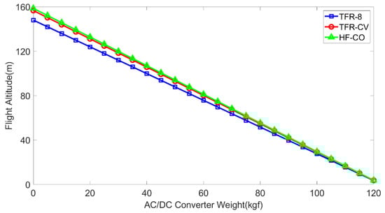 Since the weight of the power cables per unit length depends on the current that runs through them, the supplied voltage should be increased to deliver same amount of electric power. For many power transmission applications, three-phase four-wire AC scheme is adopted to minimize electric current and increase transmission efficiency. The weight of the power cable per unit length can also be reduced with this scheme. Meanwhile, as they should be flame-retardant because they are used at a fire site, HF-CO, TFR-CV and TFR-8 cables, which are widely used for high supply voltage and temperature applications, can be used for this purpose. The weights per unit length of HF-CO, TFR-CV and TFR-8 cables were measured as 0.78 kgf/m, 0.79 kgf/m and 0.83 kgf/m, respectively, and Figure 4 indicates the maximum ceiling of the tethered multicopter with those power cables depending on the weight of an AC/DC converter to be loaded onto the airframe. 600 V was considered as the supply voltage for the three-phase and four-wire system. When the weight of the AC/DC converter of the tethered flight system is 50 kgf [30], the ceiling altitude according to the application of HF-CO, TFR-CV and TFR-CV is calculated as 94 m, 93 m and 88 m, respectively.