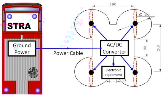 The layout of the tethered multicopter for rescue purposes in consideration of the above restrictions relevant to the size and weight is shown in Figure 5. At the bottom of the loading space of the small fire pump car, there should be a power supply system with a capacity of 100 kW as well as a winch that adjusts the length of the power cables depending on the flight altitude, and the airframe should include the AC/DC converter that properly distributes electricity from the three-phase four-wire AC power source to each BLDC motor, and flight control systems.
