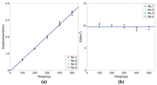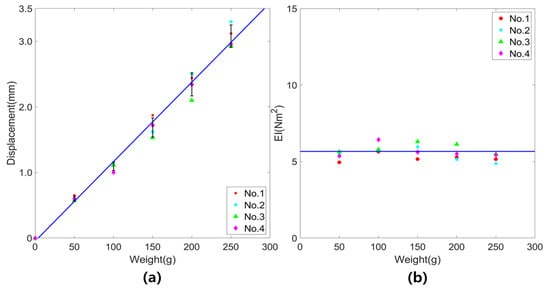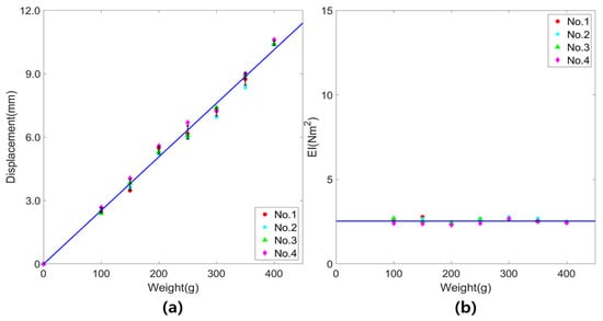 referes to the free end displacement, is the applied load on the free end, is the length of the power cable and means the equivalent flexural rigidity of the power cables. In order to reduce errors due to clearance, storage conditions and cutting methods while preparing the specimen, bending tests were carried out repeatedly with multiple specimens.