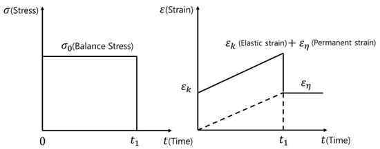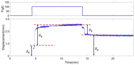 Viscosity can be expressed as a damping coefficient of a power cable by expressing Equation (2), which is a relational expression between stress and strain, as a relation between force and displacement. In order to consider the viscoelasticity of the power cable, the change in the displacement according to the application of the free end load was measured in time domain. Figure 10 shows the change in the displacement of a TFR-CV specimen; balance weight of 100 gf was applied and removed at about 5 min, and 15 min, respectively, after the measurement was started. is the displacement made by the linear spring, whereas means the displacement triggered by the linear viscous dashpot. The equivalent flexural rigidities obtained through the previous static bending tests were the result of adding the displacement by the linear spring and the linear viscous dashpot. Therefore, if the equivalent flexural rigidity of the power cable is more accurately calculated by considering only the displacement caused by the linear spring excluding the linear viscous dashpot, a larger value will be obtained than the result measured through the static bending test. According to the maxwell model, the section in which displacement due to the viscous dashpot is observed can be assumed as a first-order linear function as shown in Figure 11.