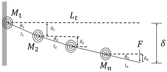 By assuming that is an equivalent spring constant of the cantilever divided into equal parts, the free end displacement of the linkage-spring model can be estimated as Equation (5).