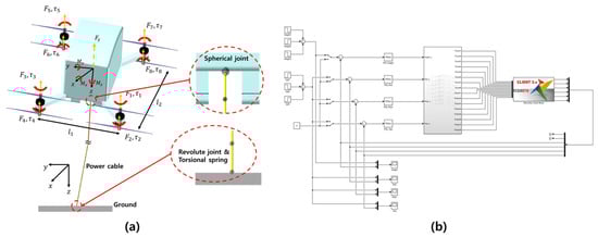 Using the damping coefficient derived from Equation (2) and the equivalent spring constant derived from Equation (6), structural model of the power cable was obtained. In addition, the power cable model is combined with the flight dynamics model of a multicopter to construct the flexible multi-body dynamics model of a heavy-lift tethered multicopter as shown in Figure 13a. To analyze the altitude control and roll attitude control command-following performance of the tethered multicopter for various conditions, a flexible multi-body dynamics simulation was performed using MATLAB Simulink and RecurDyn which is commercial CAE software focused on multibody dynamics. Since it was difficult to obtain various parameters required to perform dynamic simulation of heavy-lift multicopter, the dynamic modeling of the multicopter part was relatively simplified compared to the electric power cable part. For mass and moment of inertia arranged in Table 7, values roughly estimated from the results of 3D modeling using the published specifications of Ehang 184 were used, and the effect of viscous friction or drag due to air flows was assumed to be negligible while performing simulations in conditions close to hovering. The maximum thrust that each of the eight propellers installed in the multicopter could produce was calculated by dividing the thrust equal to twice the maximum take-off weight by 8, the number of propellers. The power cable was divided into 10 linkages, and each couple of linkages were connected by a revolute joint to limit its motion within a plane. A torsional spring was added on each revolute joint and its equivalent torsional spring constant was calculated by substituting the flexural rigidity of the power cable, which was obtained from the previous test, into Equation (6).