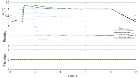 An environment as shown in Figure 13b was created to simulate position and attitude control of the tethered multicopter with power cables consisting of multiple links and springs. Feedback control simulation was performed on roll, pitch, yaw attitude and altitude of the multicopter by importing the flexible multi-body dynamics model to MATLAB simulink while independent PID control scheme was employed for each degree of freedom. Two flight altitude conditions of 5 m and 90 m were selected to observe the change of dynamic characteristics according to the flight altitude of the tethered multicopter. The simulations were conducted with two torsional spring constants of TFR-CV, and , in order to confirm that the correct flexural rigidity of the power cable should be used when the dynamics model of the heavy-lift tethered multicopter is constructed.