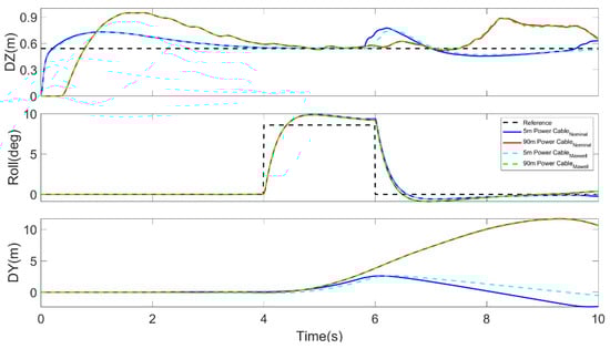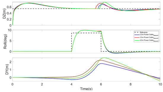 Meanwhile, significant effect of the flexural rigidity of the power cable on the horizontal motion is observed at low altitude condition in contrast with at high altitude condition. For more detailed analysis, simulations with the same roll command were conducted at flight altitudes of 2.5 m, 3.5 m and 4.5 m. As shown in Figure 17, there are relevant differences in horizontal motion with the same roll attitude maneuver despite the short altitude change. It can be concluded again that the flexural rigidity of heavy-duty power cable should be considered to obtain high control performance during take-off and landing at low altitudes.