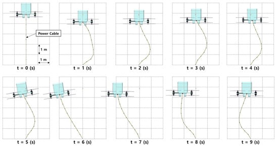 Using the mechanical properties of the power cable that consist of the tethered flight system, a multi body dynamics model can be constructed. The motion of the power cable can be analyzed with the Euler-Bernoulli beam theory if the bending displacement of the power cable is small. In case of large bending displacement is expected, however, pseudo-rigid-body method, elliptic integral solution, domain decomposition method, chain algorithm or circle-arc method are used for mathematical modeling [33,34]. The properties of the power cables obtained in the previous test were used to create DEM (Discrete Element Model), composed of multiple links and springs, by dividing the entire power cables into parts as shown in Figure 12.