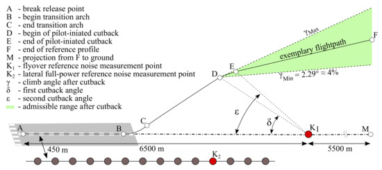 In addition, there is a lateral full-power reference noise measurement point (K), located on a line 450 m, parallel to the runway centerline. The position with the highest EPNL along this sideline is selected as the lateral full-power reference noise measurement point. For a valid certification flight, the maximum available thrust must be maintained until a cutback altitude (Point D), dependent on the number of engines, is reached. For a twin-engine aircraft, the cutback height is 300 m, for a three-engine 260 m and for a four-engine 210 m, above ground. This accounts for the excess thrust that an aircraft with fewer engines has over one with more engines due to the thrust requirements during an engine failure, i.e., One Engine Inoperative (OEI) case. After reaching the respective cutback altitude, the aircraft must climb at least with 4%, which corresponds to a climb angle of approximatly 2.29. Since the reduction in the engine thrust is not instantaneous, ICAO defines a first and a second cutback angle ( and related to point K) with the points D and E. Furthermore, the flight must be recorded up to 11 km (Point F) after the break release point. In addition, there are requirements for the calibrated airspeed at takeoff, defined relative to the aircraft-specific safe takeoff speed V2. The speed V2 + 10 knots must be reached as soon as possible after takeoff and the speed V2 + 20 knots must not be exceeded during the certification flight. Due to the requirement that the thrust setting be kept constant during calculation of EPNL, the 10 dB-down time must be completed for the lateral measurement point by the time point D is reached, in case a cutback is performed. For the flyover measurement point, the 10 dB-down time must be between points E and F for the same reason.